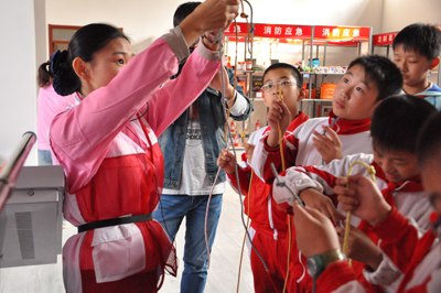 为了让大家尽可能的学会在灾难中自救,亿和海丽建设了应急体验馆,现场教大家学习怎样火灾时用救生缓降器逃生,怎样带着自救呼吸器以防窒息,怎样将动力绳或者防火逃生绳打结更容易结实以利于逃生,以及怎样在逃生过程中防止踩踏等等,一切有利于逃生的技能在体验馆里都有可能教授。