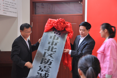青岛市地震局副局长郭玉贵、市北区区委常委副区长于洋共同为“市北区防震减灾宣传教育基地”揭牌