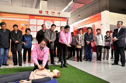 揭牌仪式开始前,出席仪式的嘉宾们还参观了海丽雅集团应急安全教育培训中心和产品展厅,观看了企业发展宣传片。在培训中心,恰逢青岛市北仲路第一小学的学生正在争先恐后的体验高层缓降、烟雾走廊逃生、模拟地震,学习消防灭火、结绳自救、医疗急救等知识,体验现场异常热闹。孩子们学习的津津有味、不亦乐乎。徐长聚主任在饶有兴趣的看着孩子们学习体验场景的同时,不住的点头称赞:企业面向青少年应急安全教育事业,实在了不起;他指出,“生命诚可贵,安全必相随”,对集团研发的高品质惠民应急产品给予肯定。他同时鼓励企业要永不满足,致力创新,在关心下一代工作方面有所作为,在争创国际知名品牌道路上不断前行。