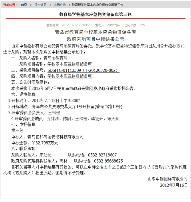 青岛市教育局学校基本应急物资储备库政府采购项目