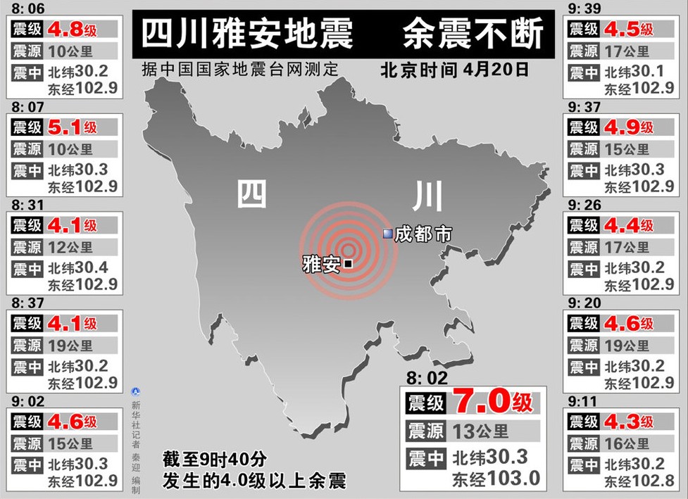 国家卫生计生委21日公布,截至当日16时,四川省卫生计生部门共救治伤员8761人次,住院1397人,其中重症及危重症265人。据国家卫生计生委通报,目前伤员救治主要集中在7个地市,分别为雅安市7531人次、成都市1034人次、德阳市91人次、资阳市27人次、眉山市43人次、甘孜州24人次、自贡市11人次。