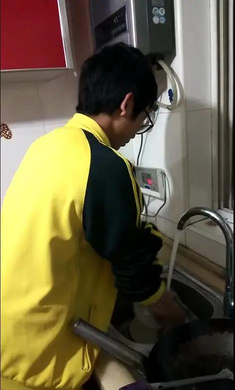 小盛性格腼腆,乖巧懂事,正在帮妈妈洗碗
