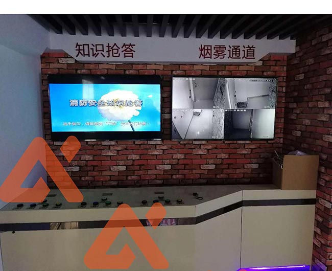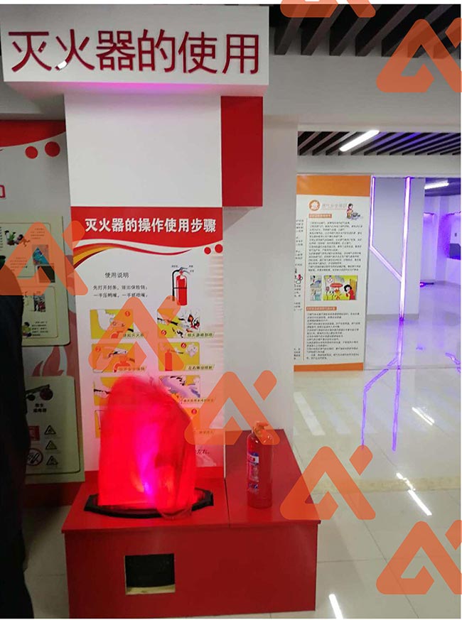 该区域有一些消防标识和一个3Dmapping模拟火灾场景,可模拟电动车违规充电引发火灾的演变过程。并安装有模拟灭火的体验设备,有5种常见的场景,以及6种不同品种的灭火器,通过体验模拟灭火,让群众学会选择正确的灭火器来应对不同的火灾现场。