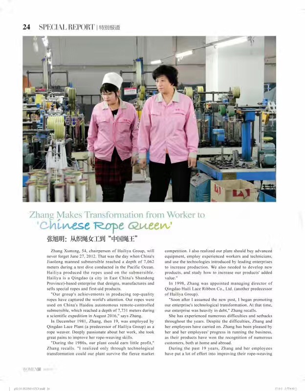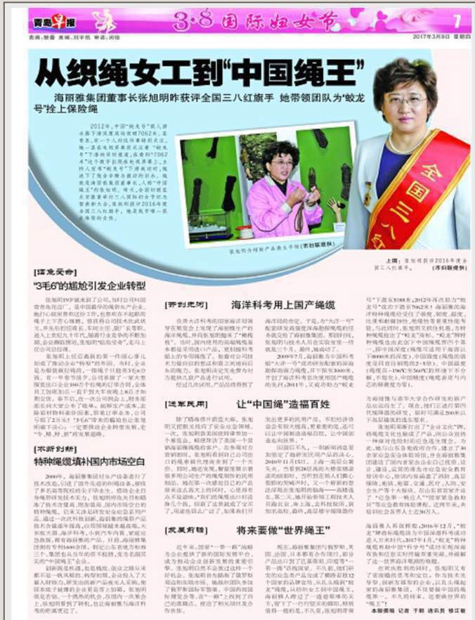 “业精于勤,荒于嬉;行成于思,毁于随”,用在张旭明身上最贴切。36年的光阴,张旭明毫不吝啬的奉献给海丽雅,从织绳女工到“中国绳王”,这背后砥砺前行的痛楚也只有她自己最清楚。但是,路漫漫其修远兮,张旭明会一直秉持“大国匠心”的理念,将绳缆产业做到极致,要让自己的绳缆走出国门,站在世界的舞台上,为国争光!