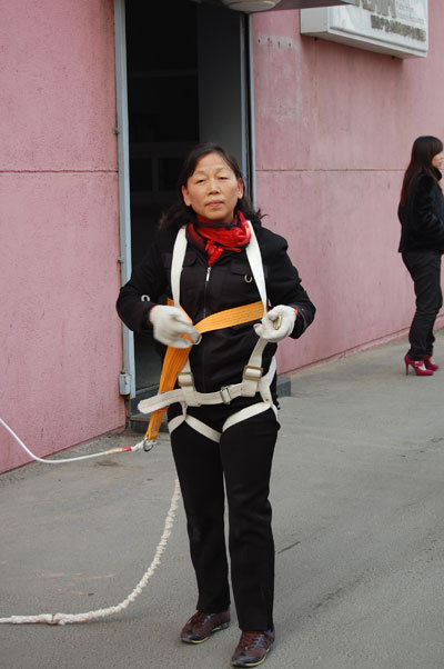 2010年11月19日下午,青岛亿和海丽高强力安全防护用品有限公司开展了高空火灾防护自救互救演习。57岁的梁子兰率先从高空使用救生缓降器安全下落到地面,并给大家现场讲解使用方法,活动吸引了大批市民参与并现场观摩。