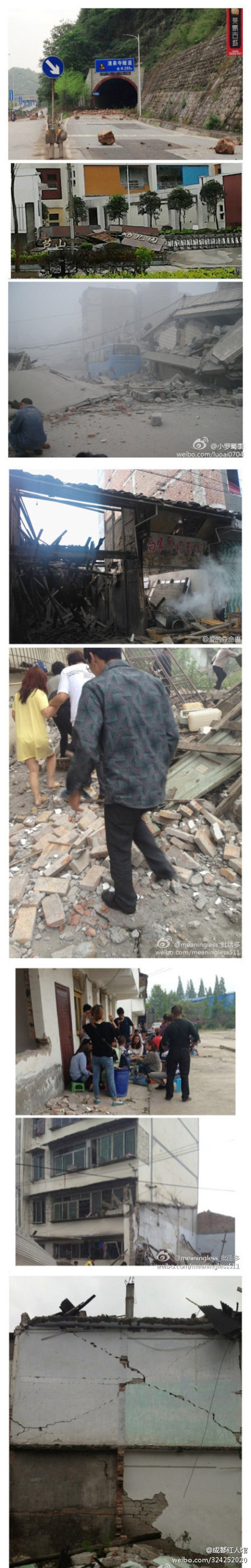 据四川省人民政府新闻发布会通报,四川全省受损的公路达2986公里、桥梁327座、变电站24座、输电线路224条,固定和移动通信基站损毁724座、通信中断乡镇16个,城乡居民住房倒塌26411间、严重损坏142449间,受损水库214座,受损堤防118.54千米。宝兴县通信全阻,天全县、芦山县通信大面积中断,通往阿坝、雅安的三条光缆环中断。