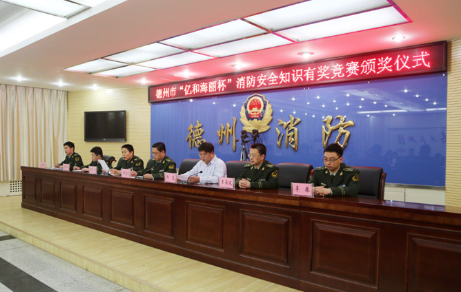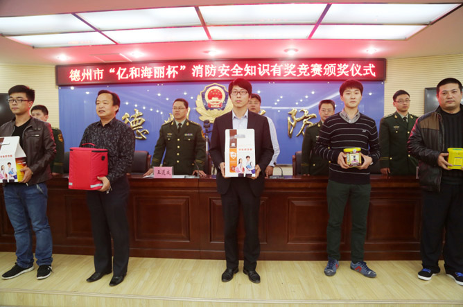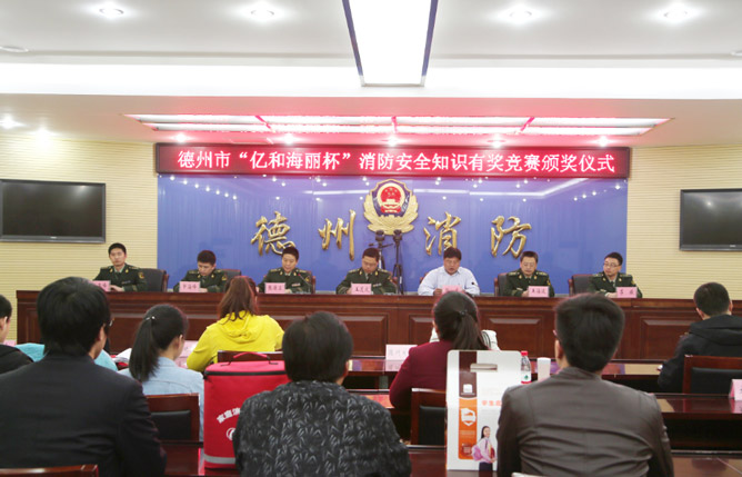 2014年3月25日“亿和海丽杯”消防安全知识有奖竞赛颁奖仪式在山东省德州市举行,德州市消防支队张保卫高级工程师通报消防安全知识有奖竞赛活动开展情况,青岛亿和海丽副总经理杨光就本次活动发表了讲话。