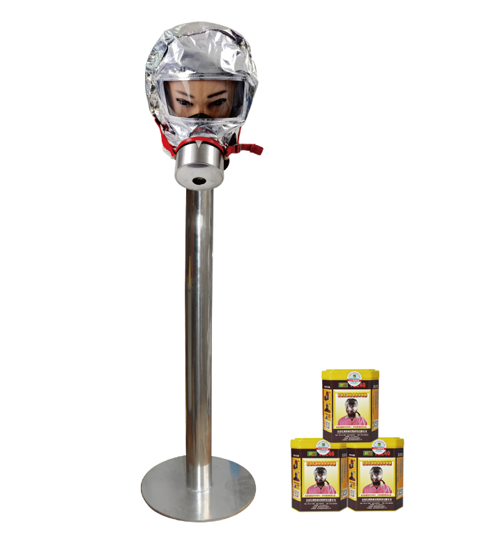 过滤式消防自救呼吸器佩戴演练装置功能介绍: 装置用于呼吸面具的佩戴演示与实际操作练习,通过实际动手可以使培训者掌握过滤式消防自救呼吸器使用技能。