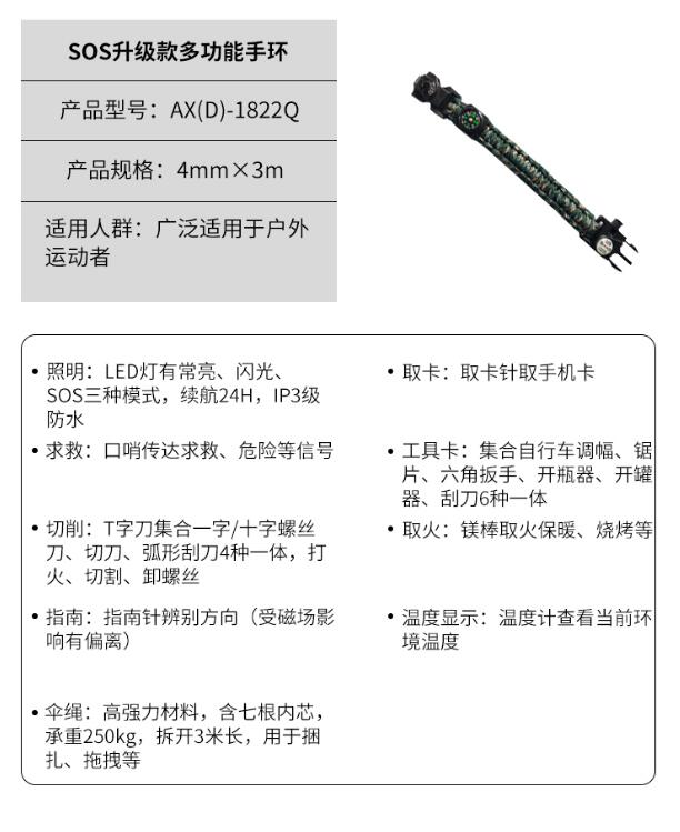 伞绳:高强力材料,包含七根内芯,承重250kg,拆开3米长,用于捆扎、拖拽等。