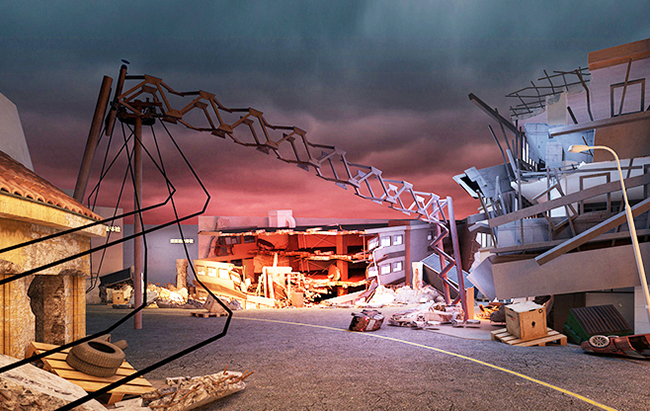 再现地震后,道路变形,有波浪状也有断裂上下错层的场景。在道路两侧有建筑物倒塌,形成通道。体验者从破损的通过穿过,到达一个相对安全的位置。在临近出口处,设置一条断掉的高压电线掉落在地上,要求体验者此处应该采取单脚跳的方式离开此区域。